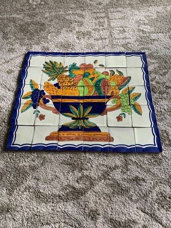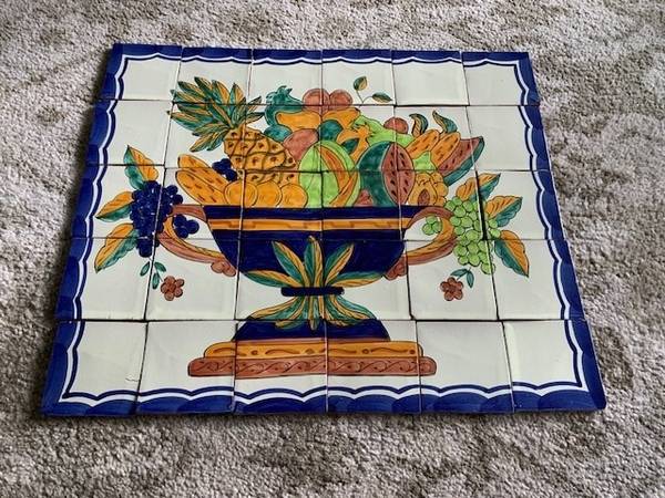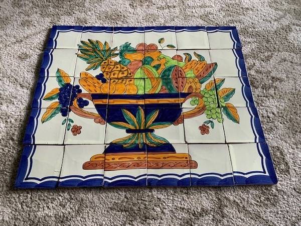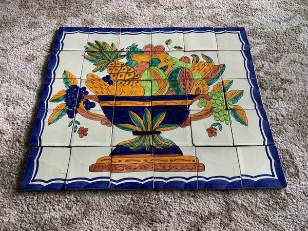 MEXICAN TALAVERA TILE ART. Each tile is 4" by 4" making the total piece 24" wide and 20" tall (plus grout). Tiles are in very good to excellent condition, with some irregularities Woand a few with some small chips on the edge (see pictures). Would make a great addition to your backsplash, the top of a tile table, or as a wall hanging.
