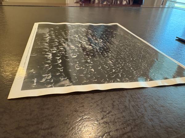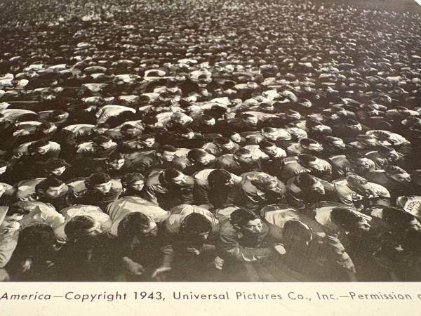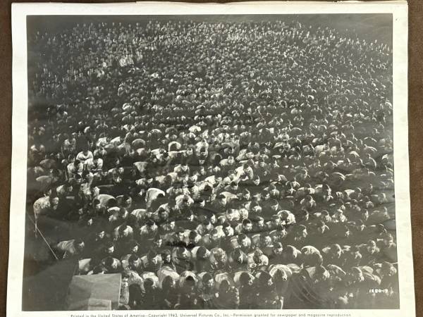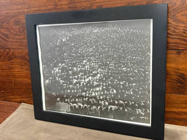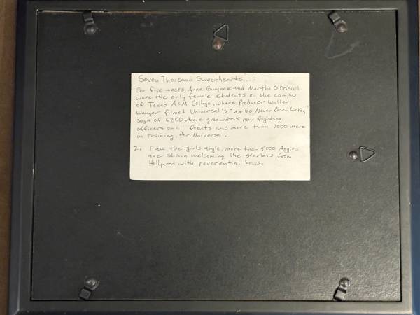 This is a very rare, framed original 1943 publicity 8" x 10" photograph from Universal Pictures showing more than 5000 Aggies welcoming the stars of the movie "We've Never Been Licked". The photo is very clear with no tears or photo discoloration, but there is edge wear (on white border, not photo itself) and some surface waviness that is shown in photo. Frame is included.