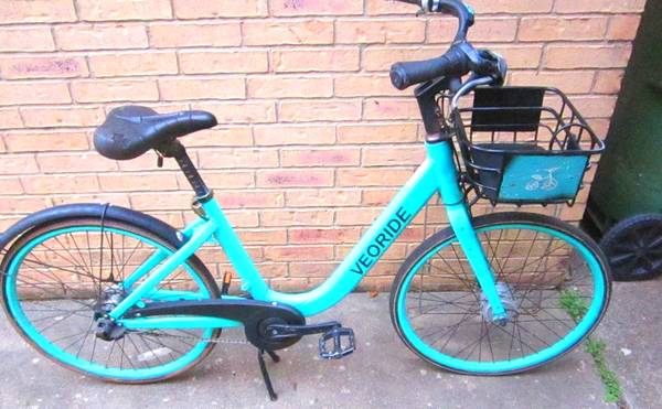 I have a 26" Veoride bicycle for sale. This is a former rental bike that I bought at a police auction. It will never have a flat tire because the tire are semi-pneumatic (manufactured with air built into the tire. It is built out of sturdy materials (like you would expect a rental to be). It comes with a basket built onto it, has a center-mounted kickstand (less likely to fall over).The seat is showing some cracking in it but a $7 padded slipcover will give it new life and a more comfortable ride. The brakes work front and back and are located in the wheel hubs so they will likely never need adjusting.