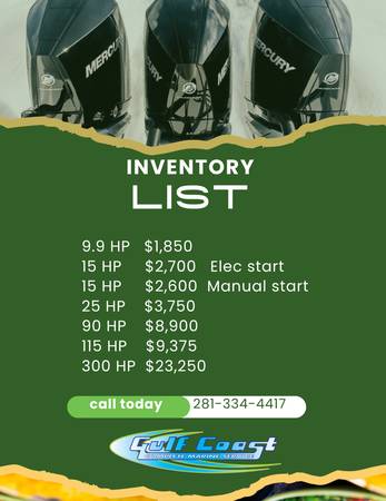 We are an authorized Mercury dealer with motors in stock. 9.9hp manual start-$1850 9.9hp electric start-$1850 15hp electric start $2700 25hp remote control-$3750 90hp electric start $8,900 115 hp...