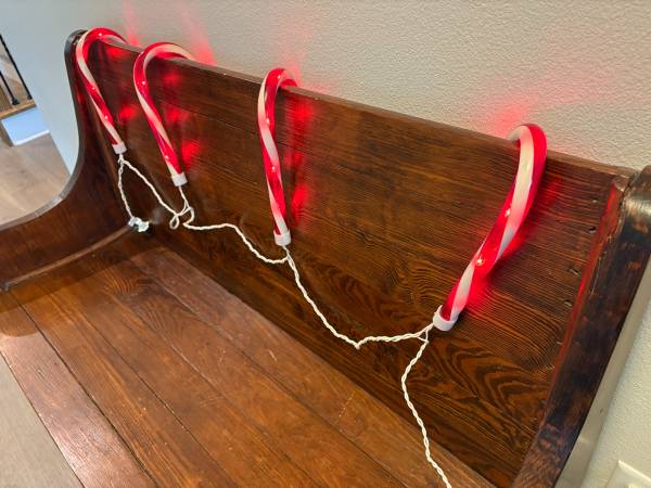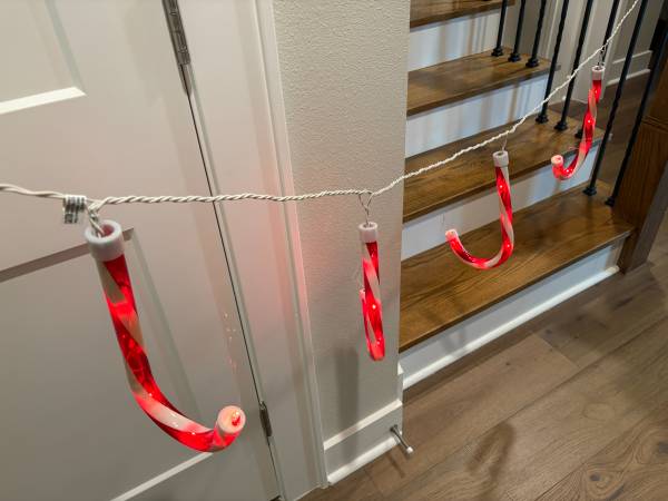 A seven foot string of four candy cane lights in good working condition. Candy canes are 9" tall. Each cane has a hanger wire