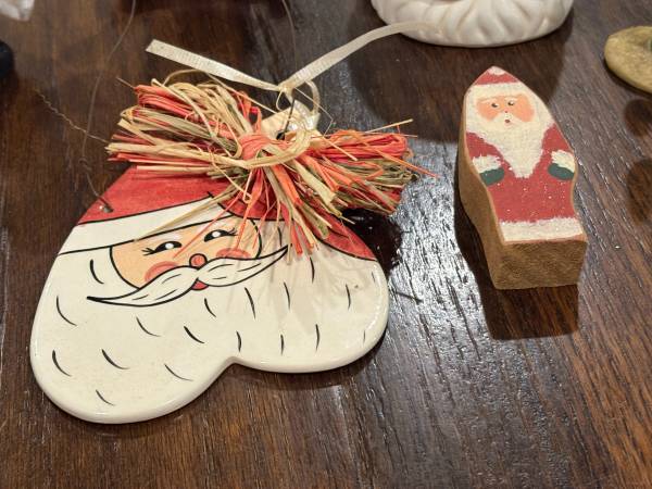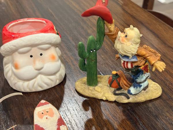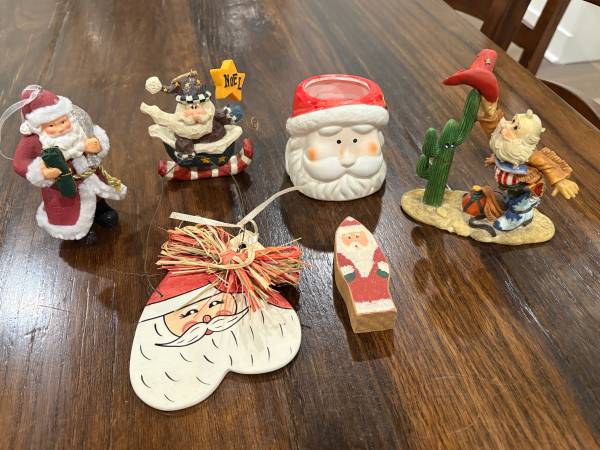 Six various Santa themed items. Tree ornaments, figurines and candle in good condition. Listed price is for all six.