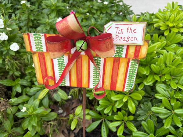 A festive petite sturdy metal yard sign for the holidays. Sign is approximately 10" x 8" with a 25" height