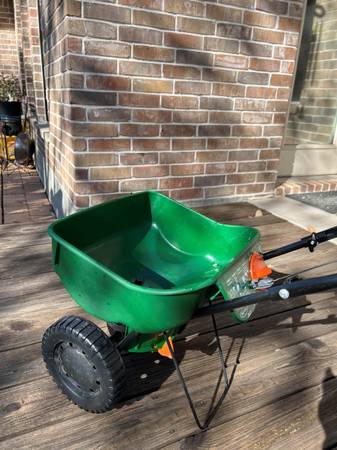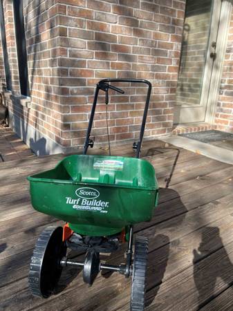 Scotts Turf Builder EdgeGuard Mini Broadcast Spreader 15-lb Capacity Compatible with Ice Melt, Salt, Fertilizer, Compatible with Seed.Great condition and function well.