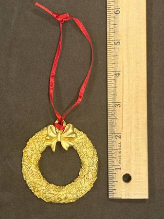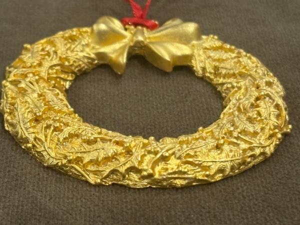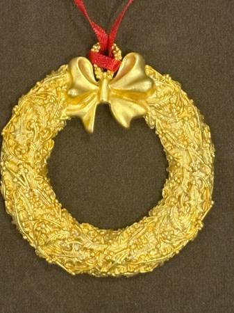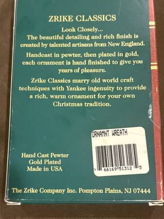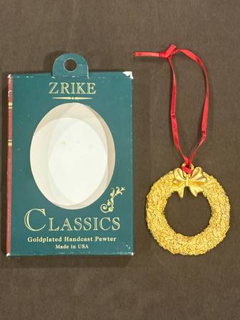 Collectible, vintage, gold plated, hand cast pewter Christmas ornament by Zrike Classics in excellent condition. Original box. Wreath is 2.5" diameter