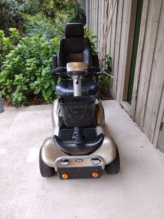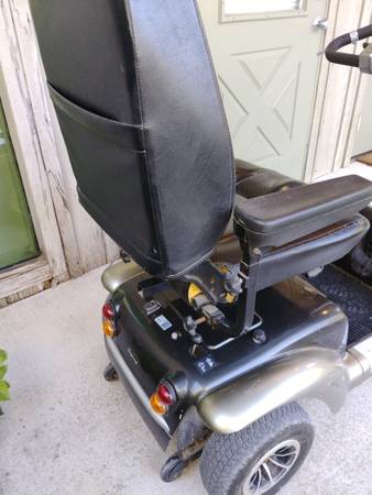 High ground clearance and pneumatic tires ideal for outdoor travel. Industry-leading 500 lb. weight capacity. Adjustable angle, delta tiller for comfortable, ergonomic control. Standard safety package includes headlight, horn, turn signals and dual rearview mirrors. Additional hand-operated drum brake for use when extra-quick stops are necessary. Front and rear suspension for a more comfortable ride. Anti-tip wheels for greater safety. Comfortable swivel Captain's seat with fold-down backrest and adjustable height headrest. Removable flip-up armrests have adjustable height, width and angle. Seat can be moved forward or backward using the auto-style seat slides. All seats are height adjustable and feature 25 degrees of recline and four height adjustments, from 27" to 30". Batteries included. *NO Mirrors. Seat and Handle Folds