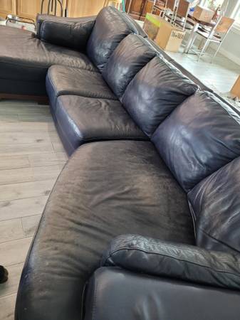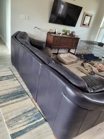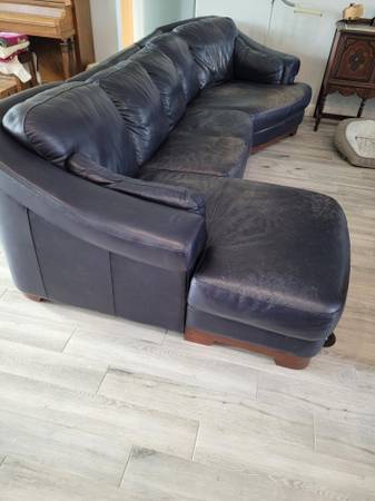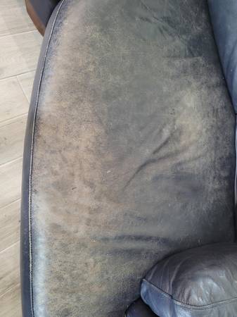 Used large leather sofa. See photo for dimsensions. 141 inches in length. Cushions have some wear from dogs and humans for 20 years. Posted photos for the most worn area. Unit is still sturdy and solid. Comes apart into 3 pieces. and clips together. Purchase about 20 years ago for over $2,000.