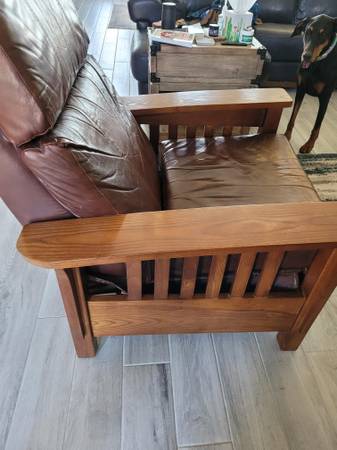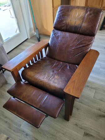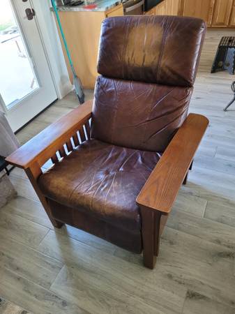 Mission style recliner for sale. Still in good shape. Purchased from Dillards. Reclines back into two positions. Slight wear but sturdy and solid.