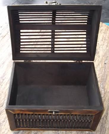 Here is a highly intricate, well designed wood box. Measures 8-3/4” tall x 7-1/2” wide x 11” long. Also has a cool working latch. $20 or best offer. Would easily retail for $65.