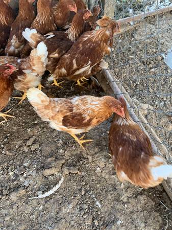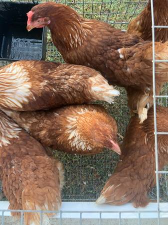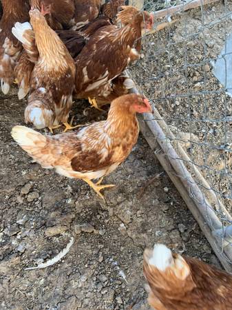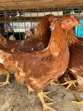 5 1/2 month old red sex link pullets, great large brown egg layers. Licensed with The Texas Animal Health Commission. Interested call or text 979-two zero four-2474. NO CODES AND NO E-MAILS