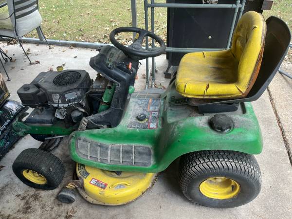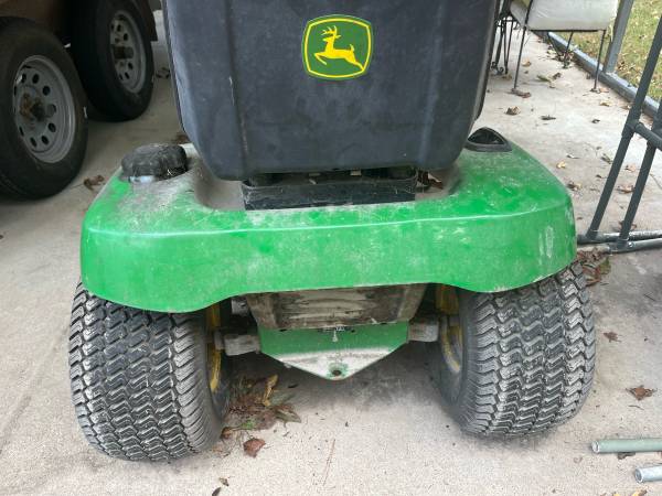 Engine is good (needs jump start) but will not move forward or backward. Blades turn. Rear tires are practically brand new with maybe 4-5 hours on them. Engine has 701 hours. Deck has rust but still solid and not rusted through. Maybe a 2004 model. Could be a simple transmission fix, I just don’t care to check into it.