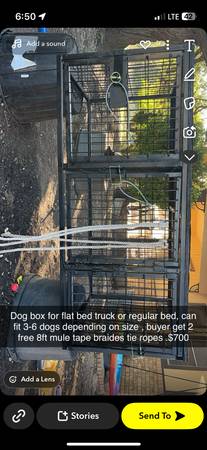 Dog box for regular truck bed or flat bed , will fit 3-6 dogs depending on size , one box can be locked , has been painted with rust oleum paint and has a heavy plastic roof can deliver or meet in the middle somewhere, cash only $700 call or text show contact info