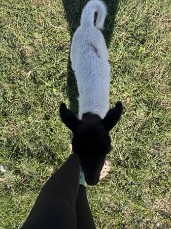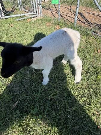 2 week old bottle ram lamb. He is a Dorper cross. His dad is a registered doper ram. Contact me with anymore questions! Bottle baby