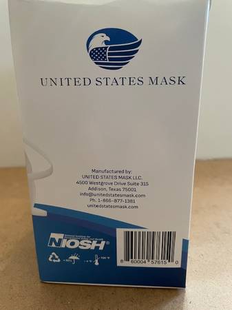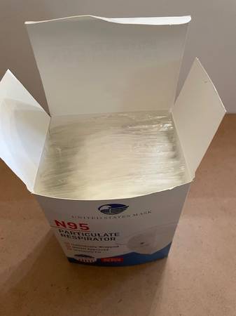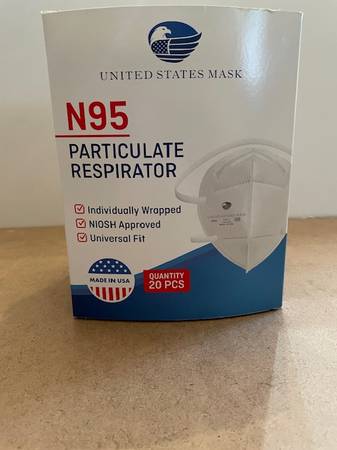 N95 masks, individually wrapped, box of 20, made by United States Mask Co., Arlington TX. 5-layer construction, NIOSH approved, durable nosepiece prevents glasses fog and rebending. Reliable elastic bands fit across back of head, or can be cut and tied to fit behind the ears. In nonmedical environments, each mask can be reused many times. New (that is, never opened). $10. Prefer cash. Can take Venmo, Zelle, PayPal. Near downtown Bryan.