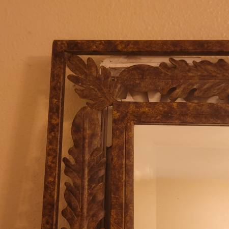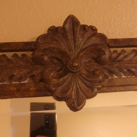 Beautiful ornate metal mirrors set of 2 for $75 or $50 each. Measures 22-3/4" wide and 34" tall with the ornate middle piece both at the top and bottom. In excellent condition.