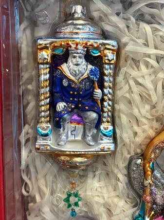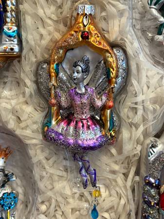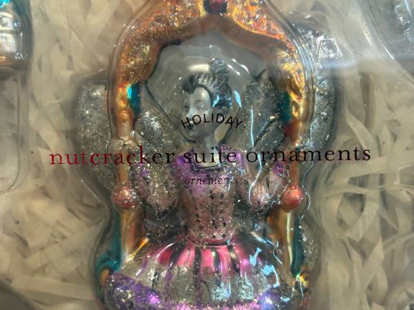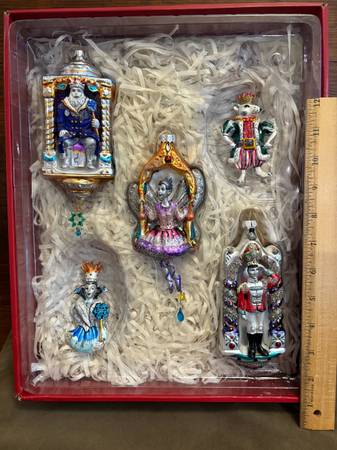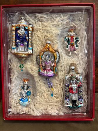 This collectible set of Pottery Barn Nutcracker Suite blown glass ornaments includes three ornaments (Sugar Plum Fairy, Nutcracker Prince & King) in excellent condition. Ornaments are approximately 6.5" tall. In addition, included are two figures from broken ornaments that were part of the original set of five.