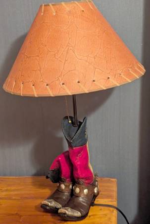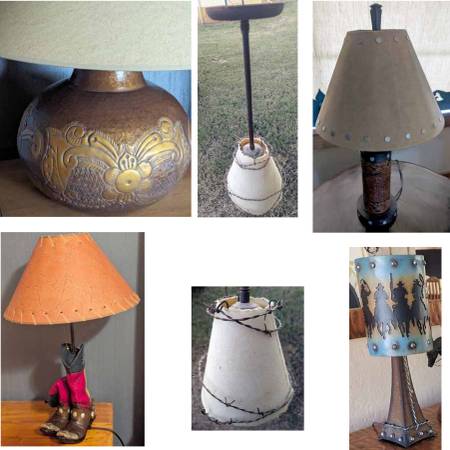 1). Copper Lamp (have 2) 29”height x 14” diameter 2). Western Leather Tooled Lamp - SOLD 24” height x 13” diameter 3. Western Red Boots Lamp - SOLD 24” height x 16” diameter 4. Leather/Metal Blue...