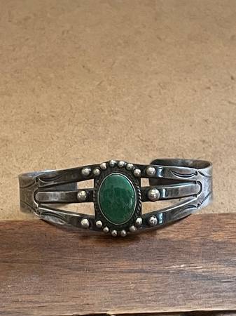 Sterling silver bracelet with a single turquoise stone. Purchased in New Mexico or Arizona, probably in the late 1930s. Navajo or Zuni. $120. Prefer cash. Can take Venmo, Zelle, PayPal. Near...
