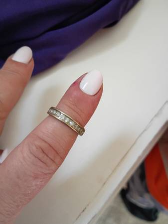 This channel set 10k gold band has 11 small diamonds. It is a comfort fit band, narrow in the back. Not too fancy, but enough sparkle to look pretty. Size 7