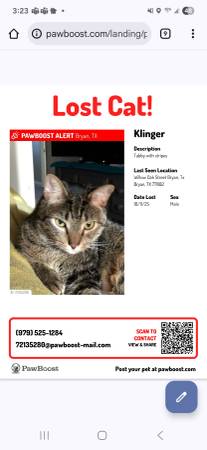Please help me find my cat. $1000 reward offered for his safe return. He has 2 microchips and is Neutered. He has been missing since October 11 2025 from Wheeler Ridge Subdivision in Bryan. Please...