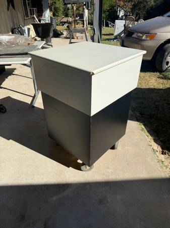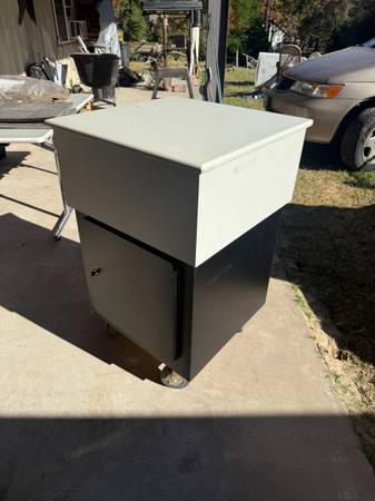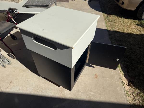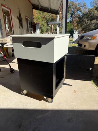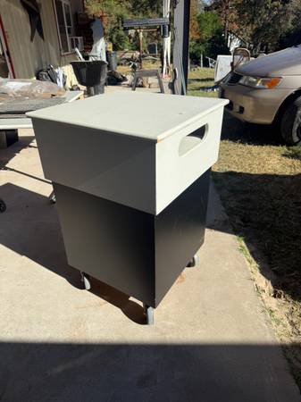 "Custom-built rolling storage cart with a cabinet and casters. This is a sturdy, functional piece that works great as a mobile workstation, a craft room organizer, or extra storage for a garage or workshop.