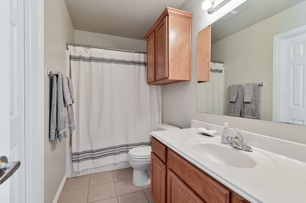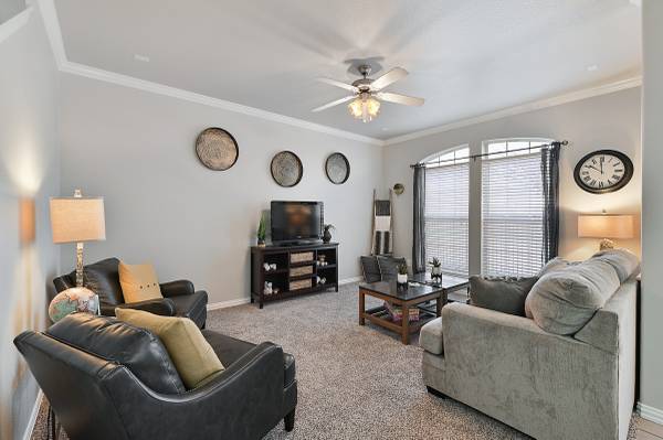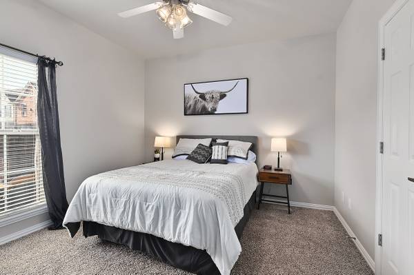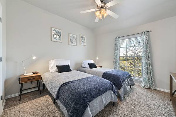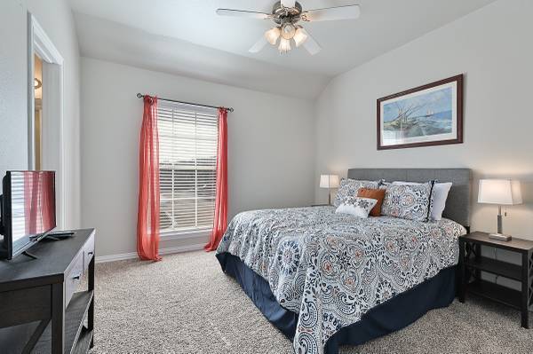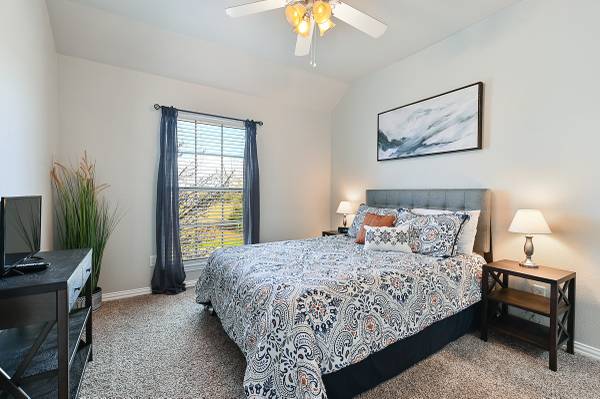 It is conveniently located just 9 minutes from the Texas A&M University and on the shuttle bus route. The living room features plush furniture and décor, creating a welcoming atmosphere for watching football games or celebrating your special Aggie. The dining area and adjoined eat-in bar provide ample space for guests to enjoy meals together. The fully furnished kitchen also features gleaming granite counters, a pantry, black appliances, and fridge! Each bedroom is thoughtfully equipped with a flat-screen television for your entertainment.