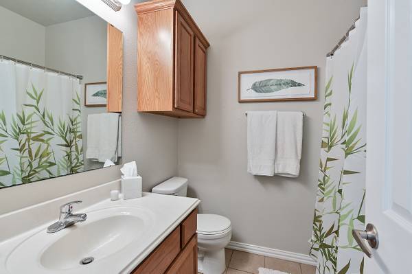 Upstairs, you'll find three bedrooms: two featuring queen-sized beds with ensuite bathrooms, and one offering two twin-sized beds with a bathroom conveniently located across the hall. The downstairs bedroom also includes a queen-sized bed, with another full bathroom just steps away. Directly across the street lies Central Park, a lovely spot for fishing and leisurely walks. If you're in the mood for entertainment, head just a few blocks down to the Wolf Pen Creek Amphitheater, where you can catch an outdoor concert or festival, soaking in the community.