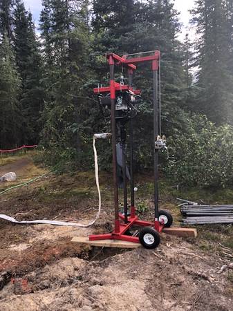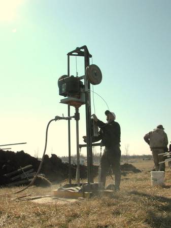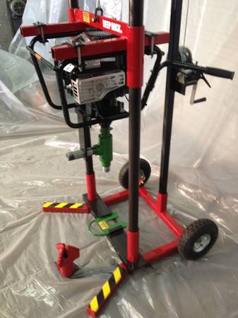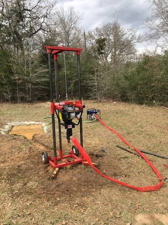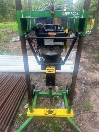 Waterwell drilling rig for sale to drill waterwell bore hole for your ponds or cattle or DEER camps or Gardens it has 100 ft od sch#80 steel drill pipe and a 6 inch drill bit and a wheel kit to move it around easy on jobsites and also a large 8 Hp KOHLER engine its great for shallow wells to 200 ft if u nreed to drill more than 100 ft just get more drill pipe at $750 per extra 50 ft its a new DEEPROCK waterwell drilling rig u can look on www.deeprock.com and see them and other rigs u may like to drill a well bore hole and u can set ur 4 inch pvc pipe with a well pvc screen in the bore hole and pump your water out this is for farmers and gardeners and DIY ers that want a shallow waterwells for there own use on there on land thanks for looking its 8 ft tall and 36 inches wide and has a hand crank 1200 lb hand crank wench some persons get a DC/Winch and make it super duper easy u can get a warren 2500 lab winch and attach it like in one of the pictures